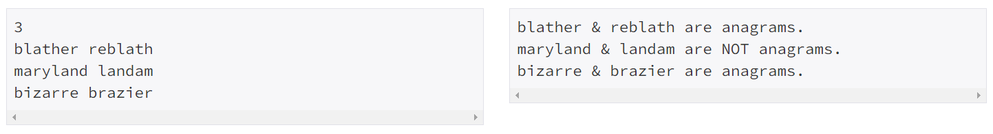 - 정렬한 두 단어가 같아면 are anagrams를 아니다면 are NOT anagrams를 출력한다.