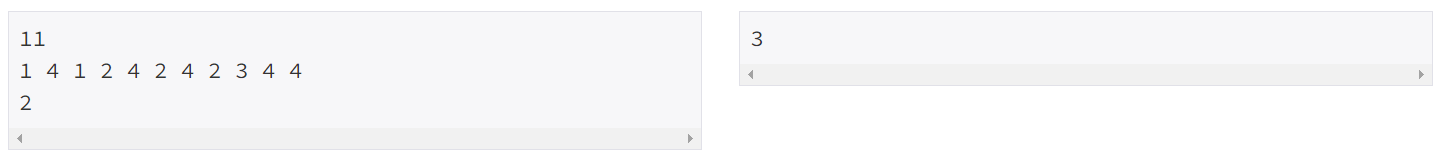 첫째 줄에 정수의 개수 N(1 ≤ N ≤ 100)이 주어진다. 둘째 줄에는 정수가 공백으로 구분되어져있다. 셋째 줄에는 찾으려고 하는 정수 v가 주어진다. 입력으로 주어지는 정수와 v는 -100보다 크거나 같으며, 100보다 작거나 같다.