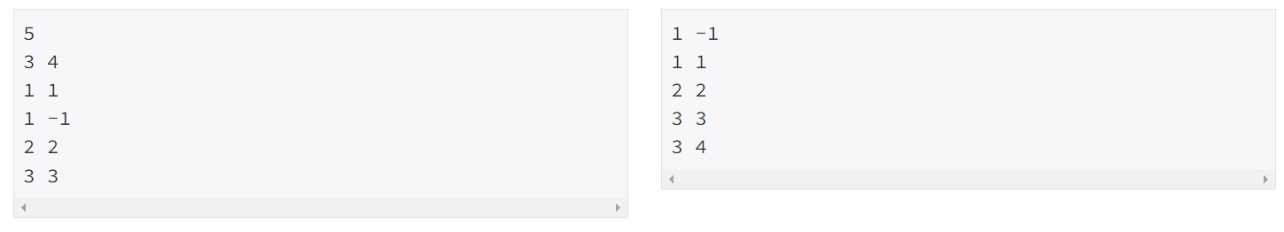 2차원 평면 위의 점 N개가 주어진다. 좌표를 x좌표가 증가하는 순으로, x좌표가 같으면 y좌표가 증가하는 순서로 정렬한 다음 출력하는 프로그램을 작성하시오.