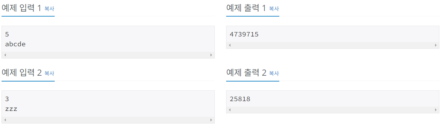 첫 줄에는 문자열의 길이 L이 들어온다. 둘째 줄에는 영문 소문자로만 이루어진 문자열이 들어온다.