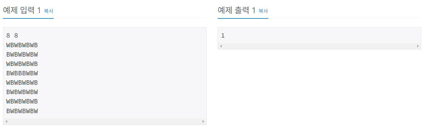 지민이는 자신의 저택에서 MN개의 단위 정사각형으로 나누어져 있는 M×N 크기의 보드를 찾았다. 어떤 정사각형은 검은색으로 칠해져 있고, 나머지는 흰색으로 칠해져 있다. 지민이는 이 보드를 잘라서 8×8 크기의 체스판으로 만들려고 한다.