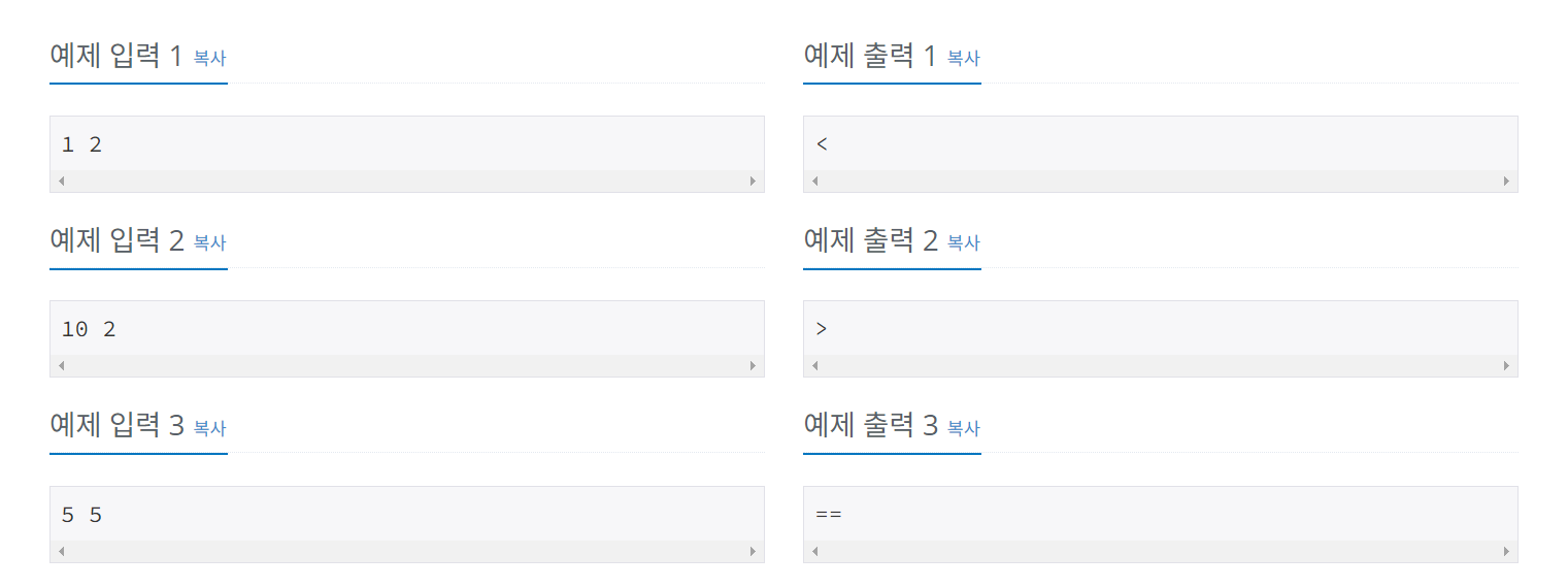 - A가 B보다 큰 경우에는 '>'를 출력한다.