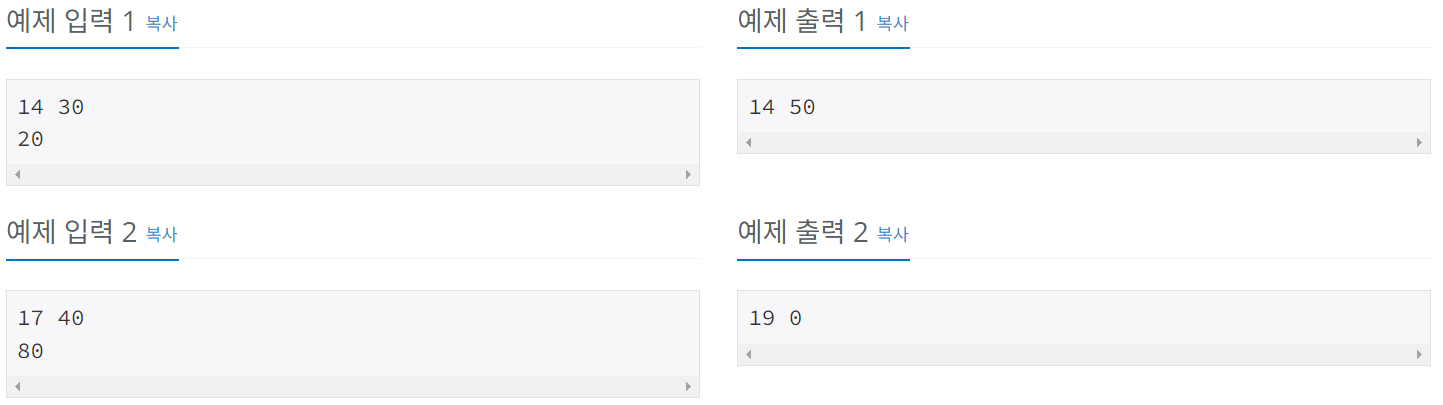 첫째 줄에는 현재 시각이 나온다. 현재 시각은 시 A (0 ≤ A ≤ 23) 와 분 B (0 ≤ B ≤ 59)가 정수로 빈칸을 사이에 두고 순서대로 주어진다. 두 번째 줄에는 요리하는 데 필요한 시간 C (0 ≤ C ≤ 1,000)가 분 단위로 주어진다.